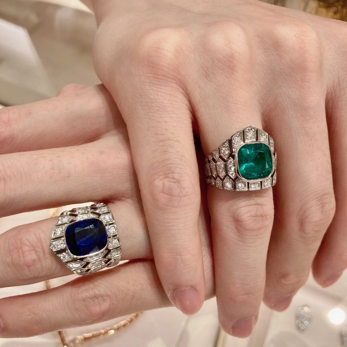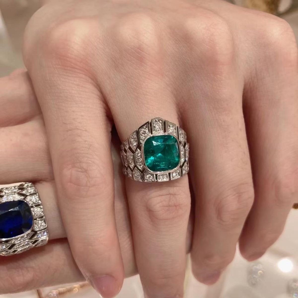 Bright blue gemstone full of diamond ring fingers